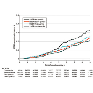 在226 695例特定患者(平均年龄58.6岁±10.7岁;51.7%为女性)进行的328 416例次结肠镜检查中,经过2 038 816人-年的随访,共发现562例PCCRC。PCCRC的绝对发病率随SSLDR四分位数的升高而下降,从最低四分位数的3.9/1万人-年降至最高四分位数的2.4/1万人-年。与SSLDR最低四分位数的患者相比,最高四分位数患者的PCCRC风险显著降低(多因素分析:HR=0.69,95%CI 0.50~0.94,P=0.01),且主要与近端PCCRC风险降低相关。较高的SSLDR与较低的全因死亡率(第二四分位数:57.7/1万人-年,第三四分位数:58/1万人-年)和结直肠癌相关死亡率(第二四分位数:0.2/1万人-年,第三四分位数:0.2/1万人-年)相关,但与最低四分位数相比,在最高四分位数中该相关性不显著。