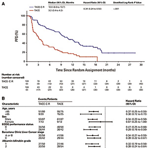 不可切除HCC(巴塞罗那临床肝癌A~C期,无肝外转移)且肝功能为Child-Pugh A级的患者,根据大血管侵犯、酪氨酸激酶抑制剂治疗史和既往TACE次数进行分层,分别接受TACE联合卡瑞利珠单抗(200 mg,每3周一次)和阿帕替尼(250 mg,每日一次;TACE-C-R组)或单用TACE(TACE组)。主要终点是意向治疗人群中,按复合标准(根据第5版《肝癌疗效评价标准》定义的疾病进展、肝功能一过性恶化至Child-Pugh C级,或TACE失败或难治)评估的无进展生存期。