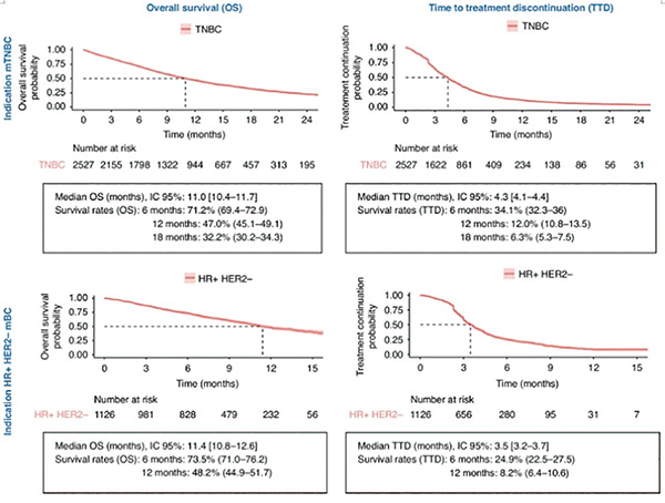 利用法国国家健康数据系统,该研究纳入了在2021年7月1日至2023年12月31日开始戈沙妥珠单抗治疗的所有患者,随访至2024年6月30日。研究记录患者人口统计学特征、合并症和既往治疗;通过Kaplan-Meier法估计总生存期和至治疗终止时间,并通过多变量Cox模型确定OS的预后因素。