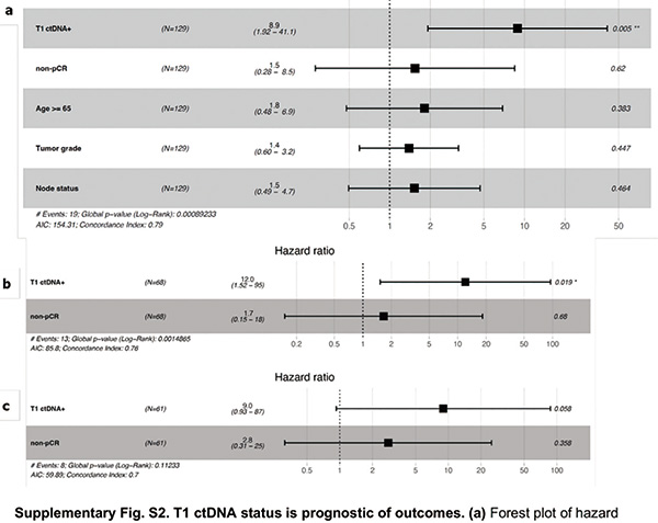 然而,预设的次要目标得以达成。新辅助治疗后检测到的ctDNA是复发的预后因素(HR=8.9,95%CI 2.4~33,P=0.001),且独立于pCR状态。此外,手术后检测到的ctDNA可识别出具有极高复发风险(HR=128,95%CI 15~1083,P<0.001)的患者,而手术后ctDNA阴性患者的5年无浸润性疾病生存率达94%。
