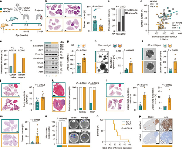 与青年期小鼠模型相比,老年期小鼠模型的原发性肺肿瘤负荷降低2.5倍;且不仅仅是负荷低,还表现出肿瘤数量更少、体积更小、增殖标志物(如磷酸化组蛋白 H3)的表达水平更低,但恶性程度更高的特征。在特定的观察窗口期,青年期小鼠模型原发性肺肿瘤负荷随时间呈线性增加;老年期小鼠的肿瘤负荷保持较低水平,但却极早地出现了局部淋巴结和远端器官的转移,并伴随着总生存期的急剧缩短。
