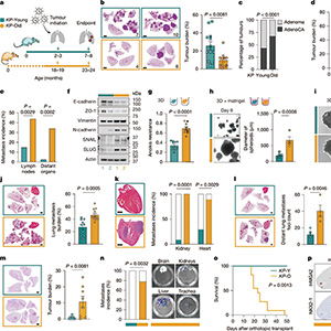 为对此进行探讨,研究者分别在2~3月龄和18~19月龄经典KP小鼠模型(携带 Kras-G12D 突变且 Trp53 基因敲除)肺部,通过气管内滴注含有 Cre 重组酶的病毒颗粒,同步诱发肺部肿瘤,分别代表青年期和老年期肺癌模型。在该体系中,18~19个月大老龄小鼠在经历5~6个月肿瘤发展期后,其生理年龄恰对应人类70岁左右,完美复刻人类非小细胞肺癌最典型的高发受众群体特征。