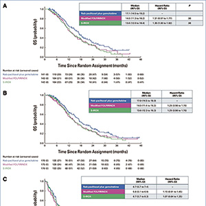 截至首次随访调查截止日期,ITT人群中位随访时间为10.1个月。白蛋白结合型紫杉醇联合吉西他滨组的中位OS更新为17.0个月,mFOLFIRINOX组为14.0个月(HR=1.29,95%CI 0.98~1.70),S-IROX组为13.6个月(HR=1.29,95%CI 0.98~1.70)。PFS方面,白蛋白结合型紫杉醇联合吉西他滨组为6.7个月,mFOLFIRINOX组为5.8个月(HR=1.15,95%CI 0.91~1.45),S-IROX组为6.7个月(HR=1.07,95%CI 0.84~1.35)。