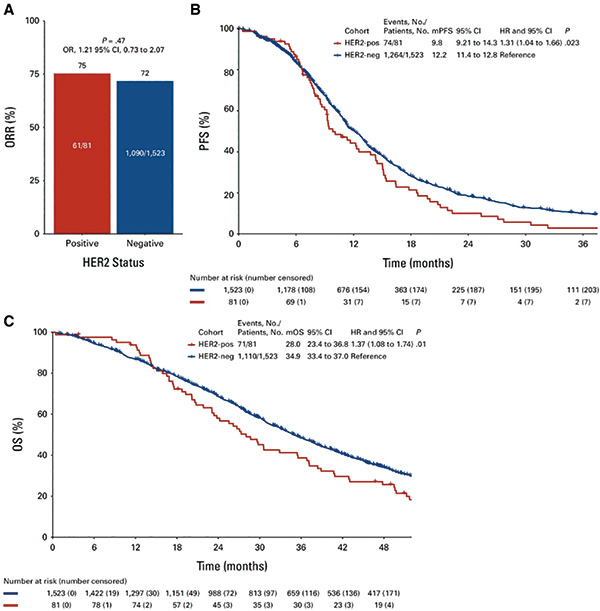 HER2阳性患者有81例(5%)。HER2阳性患者的PFS(中位PFS:9.8个月 vs. 12.2个月;HR=1.31,P=0.02)和OS(中位OS:28.0个月 vs. 34.9个月;HR=1.37,P=0.01)更短,即使在调整协变量后也是如此(调整后PFS:P=0.02;调整后OS: P=0.048)。HER2阳性与HER2阴性肿瘤的ORR相似(75% vs. 72%;OR=1.21,P=0.47)。研究者发现HER2扩增/表达状态与生物制剂(抗EGFR/贝伐珠单抗)在PFS(Pint=0.76)、OS(Pint=0.76)和ORR(Pint=0.64)的疗效影响之间不存在相互作用。