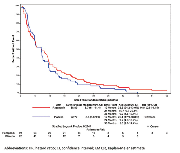 中位随访时间为61个月(95%CI 60~63个月)。帕唑帕尼组对比安慰剂组的中位PFS分别为11.8个月和7.6个月(HR=0.54,95%CI 0.37~0.79,P<0.001);共有49例安慰剂组患者交叉至帕唑帕尼组。两组的总生存期无显著差异。帕唑帕尼组相比安慰剂组,≥3级不良事件(与归因无关)的发生率更高(84% vs. 47%,P<0.001),5级死亡事件也是如此(8% vs. 0%,P=0.017)。