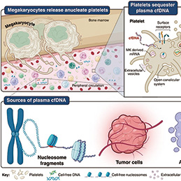 研究者分析了30名怀有男胎儿的健康孕妇血样,均在其血小板中检测到了Y染色体片段。研究者在小鼠中诱导了急性血小板减少,发现能显著增加血浆cfDNA浓度。提示血小板主动捕获循环中的cfDNA。体外实验中,血小板可在6分钟内饱和摄取DNA片段。循环中的DNA碎片很多样,有不足50 bp的超短链DNA,也可长达500 bp以上,或是与组蛋白结合或被细胞外囊泡包裹。