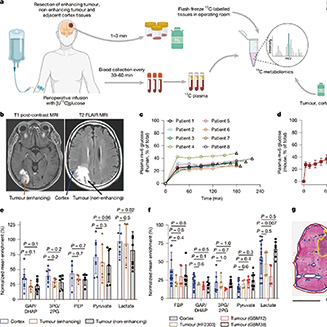 胶质母细胞瘤是恶性程度最高的癌症之一,侵袭性高、易耐药、预后差。胶质母细胞瘤异质性非常高,找到胶质母细胞瘤共通的代谢弱点,是克服治疗难题的关键。研究者给8例高级别胶质母细胞瘤患者和胶质母细胞瘤模型小鼠注射了碳同位素(13C)标记的葡萄糖,并追踪了碳源流向。