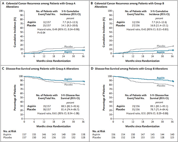 试验在2980例有完整的基因组数据的结直肠癌患者中筛选出了1103例(37.0%)存在PI3K通路基因突变的患者,其中515例属于A组突变,588例属于B组突变。在手术后重新评估是否符合入组标准后,最终626例患者接受了随机分组,A组中的157例和B组中的156例被随机分配至阿司匹林组,两组中另外157例和156例被分配至安慰剂组。