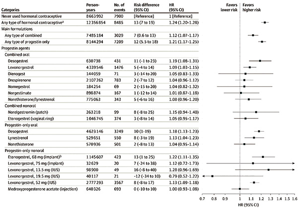 与含左炔诺孕酮的复方药片(HR=1.09,95%CI 1.03~1.15)和左炔诺孕酮52 mg宫内避孕器(HR=1.13,95%CI 1.09~1.18)相比,口服去氧孕烯单方制剂(HR=1.18,95%CI 1.13~1.23)和口服去氧孕烯复方制剂(HR=1.19,95%CI 1.08~1.31),以及含有去氧孕烯活性代谢产物依托孕烯的植入剂(HR=1.22,95%CI 1.11~1.35)显示出更高的风险。尽管使用者众多,但在醋酸甲羟孕酮注射剂、依托孕烯阴道环或屈螺酮复方口服药中并未观察到统计学上显著的风险增加。