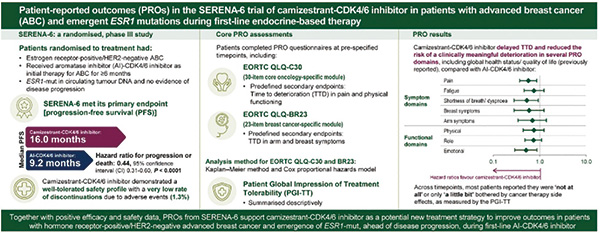 在SERENA-6试验中,对于HR阳性晚期乳腺癌患者,在一线AI联合CDK4/6抑制剂治疗期间出现ESR1突变时,从AI转换为camizestrant并继续使用CDK4/6抑制剂,与继续使用AI联合CDK4/6抑制剂相比,在无进展生存期方面取得了有统计学意义且具有临床意义的改善,并降低了GHS/QoL恶化的风险(HR=0.54)。在此报告PRO的是额外数据。