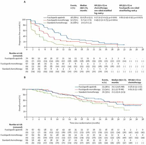 本次中期分析时,从随机分组至数据截止日的中位时间为24.2个月(IQR:13.2~31.8个月)。经盲态独立中心审查评估的中位无进展生存期在fuzuloparib-阿帕替尼组为11.0个月(95%CI 8.4~13.1个月),fuzuloparib单药组为6.7个月(95%CI 4.2~7.6个月),化疗组为3.0个月(95%CI 1.6~5.3个月)。