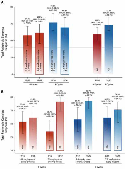 该研究旨在评估TQB2102在HER2阳性乳腺癌新辅助治疗中的疗效和安全性。这项随机、开放标签、多中心Ⅱ期研究入组了Ⅱ期和Ⅲ期HER2阳性乳腺癌患者。研究根据激素受体状态对患者进行分层,并按1∶1的比例随机分配至四个队列:队列1和队列2分别接受TQB2102 6.0 mg/kg、每3周一次、共6个或8个周期的治疗;队列3和队列4分别接受TQB2102 7.5 mg/kg、每3周一次、共6个或8个周期的治疗。主要终点是所有四个队列(每队列26例)的总病理完全缓解(tpCR)率。当tpCR率的90%CI下限超过40%时,认为疗效优于历史对照。