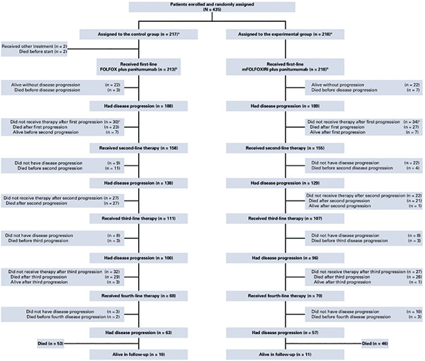 TRIPLETE是一项前瞻性、开放标签、研究者发起的Ⅲ期研究,在意大利57个中心进行。患者按ECOG PS评分(0~1分 vs. 2分)、原发肿瘤位置(左侧 vs. 右侧)和是否仅肝转移进行分层,并被等比随机分配至对照组或试验组。