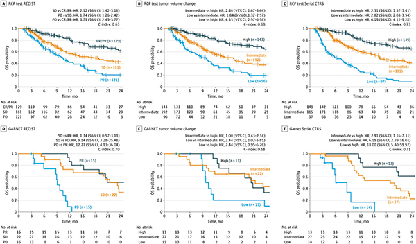 在区分总生存风险方面,连续CTRS优于RECIST,也优于肿瘤体积变化,且在测试队列(HR=6.19,95%CI 4.12~9.28)和GARNET队列(HR=18.00,95%CI 5.40~59.97)中,更高的HR可区分低存活组和高存活组。在PD-L1亚组和RECIST亚组(包括疾病稳定亚组)中,该生物标志物似乎保持住了预测价值。