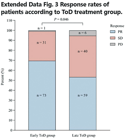 虽然第4周期后没有规定继续按时间给予治疗,但两组大多数患者仍按原有的时间段接受治疗。两组的分别有77%和38.5%的患者在中位15:00前完成了第5、第6和第7周期的输注。