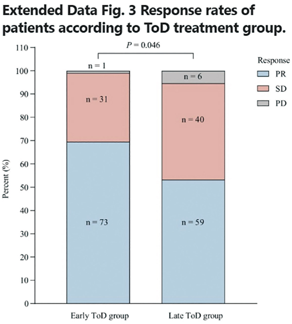 中位随访28.7个月后,15点前给药组和15点后给药组患者免疫化疗输注开始的中位时间分别为10:55和下午15:57,中位PFS分别为11.3个月(95%CI 9.2~13.4个月)和5.7个月(95%CI 5.2~6.2个月;HR=0.40,95%CI 0.29~0.55,P<0.001),中位OS分别为28.0个月(95%CI 未达到~未达到)和16.8个月(95%CI 13.7~19.9个月;HR=0.42,95%CI 0.29~0.60,P<0.001),客观缓解率分别为69.5%和56.2%(P=0.046)。治疗相关的不良事件与既定安全特征一致,未观察到新的安全信号。两组的免疫相关不良事件无显著差异。