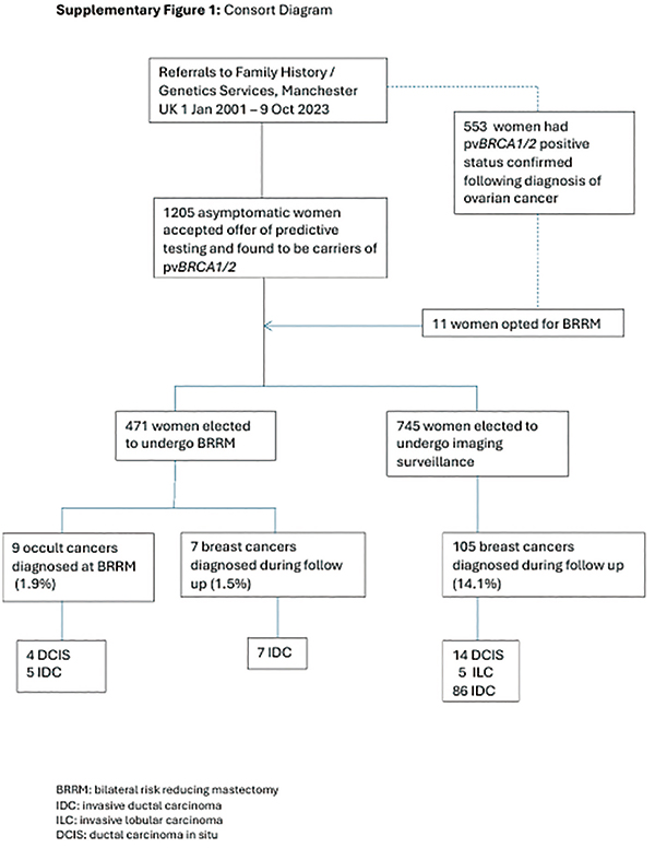 所有参与者均为地区性家族史/遗传学服务中心的访客,并已接受pvBRCA1/2的基因检测。pvBRCA1/2携带者选择BRRM或根据英国国家指南进行影像学监测。研究采用前瞻性队列设计,比较研究组之间的OS、乳腺癌特异性死亡和乳腺癌发病率。